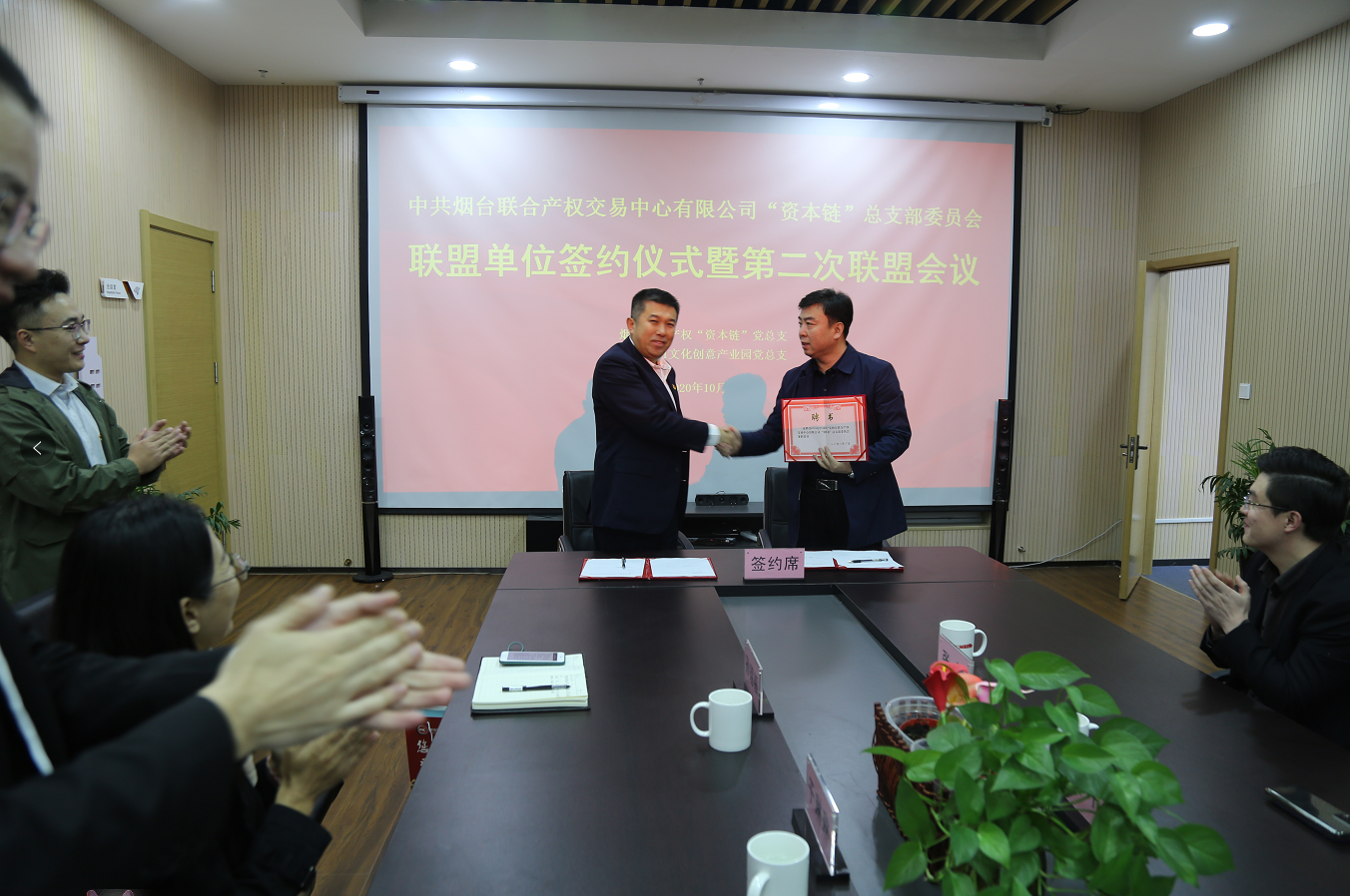 “黨是最好的信仰,建是最大的優(yōu)勢”,懸掛著的各具特色的黨建標(biāo)語,成為了煙臺(tái)1861文化創(chuàng)意產(chǎn)業(yè)園黨建文化的最好詮釋。2020年10月29日,迎著晨曦踏著朝陽,聯(lián)合產(chǎn)權(quán)“資本鏈黨總支”會(huì)同聯(lián)盟單位煙臺(tái)萊山建行黨總支共同來到1861產(chǎn)業(yè)園召開聯(lián)盟單位簽約儀式暨第二次聯(lián)盟會(huì)議。簽約儀式上,聯(lián)合產(chǎn)權(quán)黨支部書記初志杰代表“資本鏈黨總支”同1861文化創(chuàng)意產(chǎn)業(yè)園黨總支簽訂聯(lián)盟協(xié)議,并為園區(qū)黨總支書記張儉凱同志頒發(fā)了兼職委員聘書。