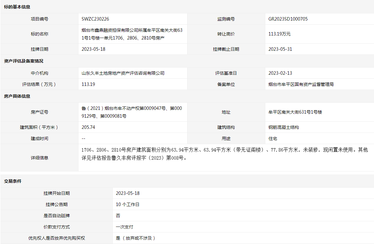 煙臺(tái)市鑫鼎融資擔(dān)保有限公司所屬牟平區(qū)南關(guān)大街631號1號樓一單元1706、2806、2810號房產(chǎn)