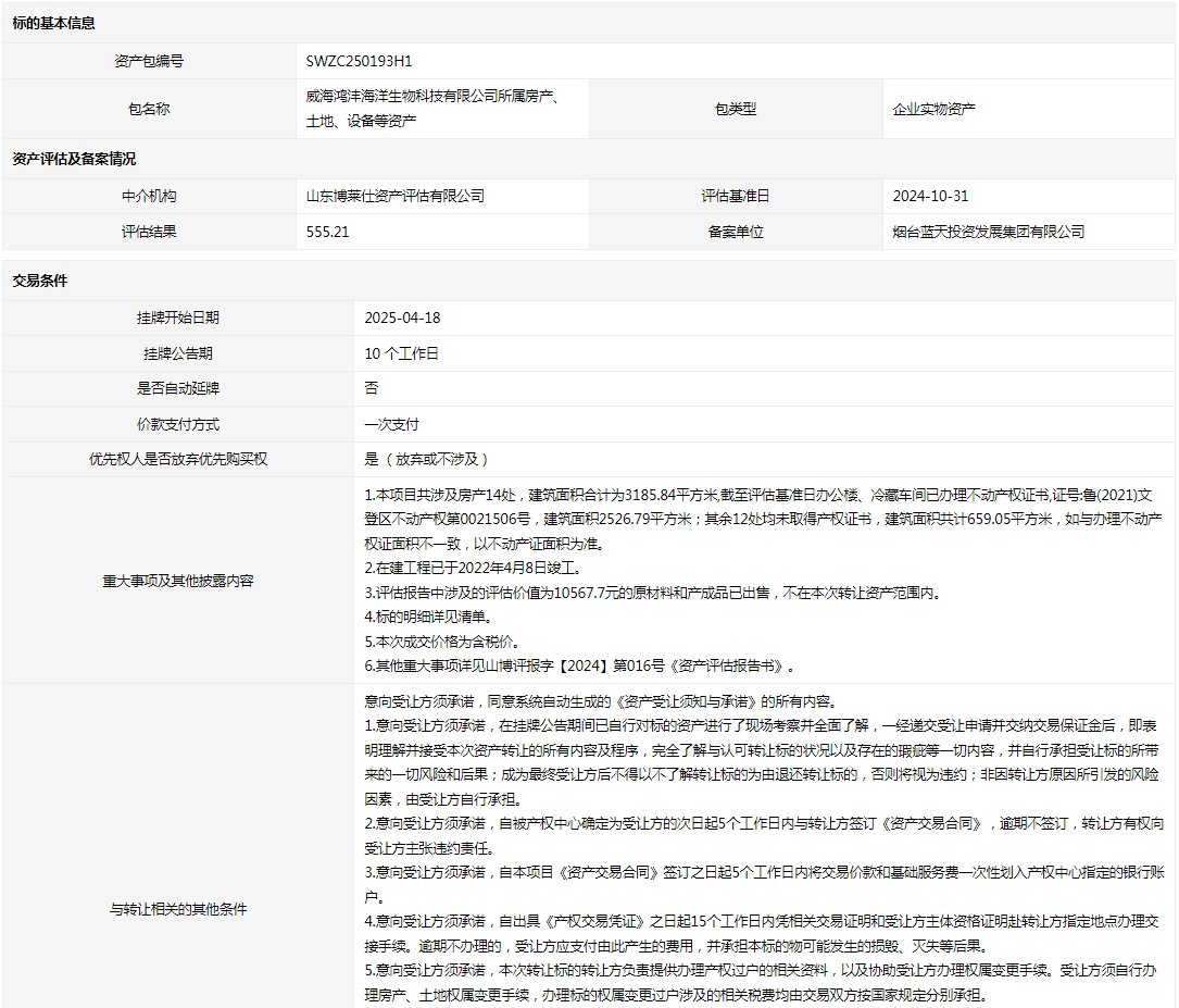 威海鴻灃海洋生物科技有限公司所屬房產、土地、設備等資產