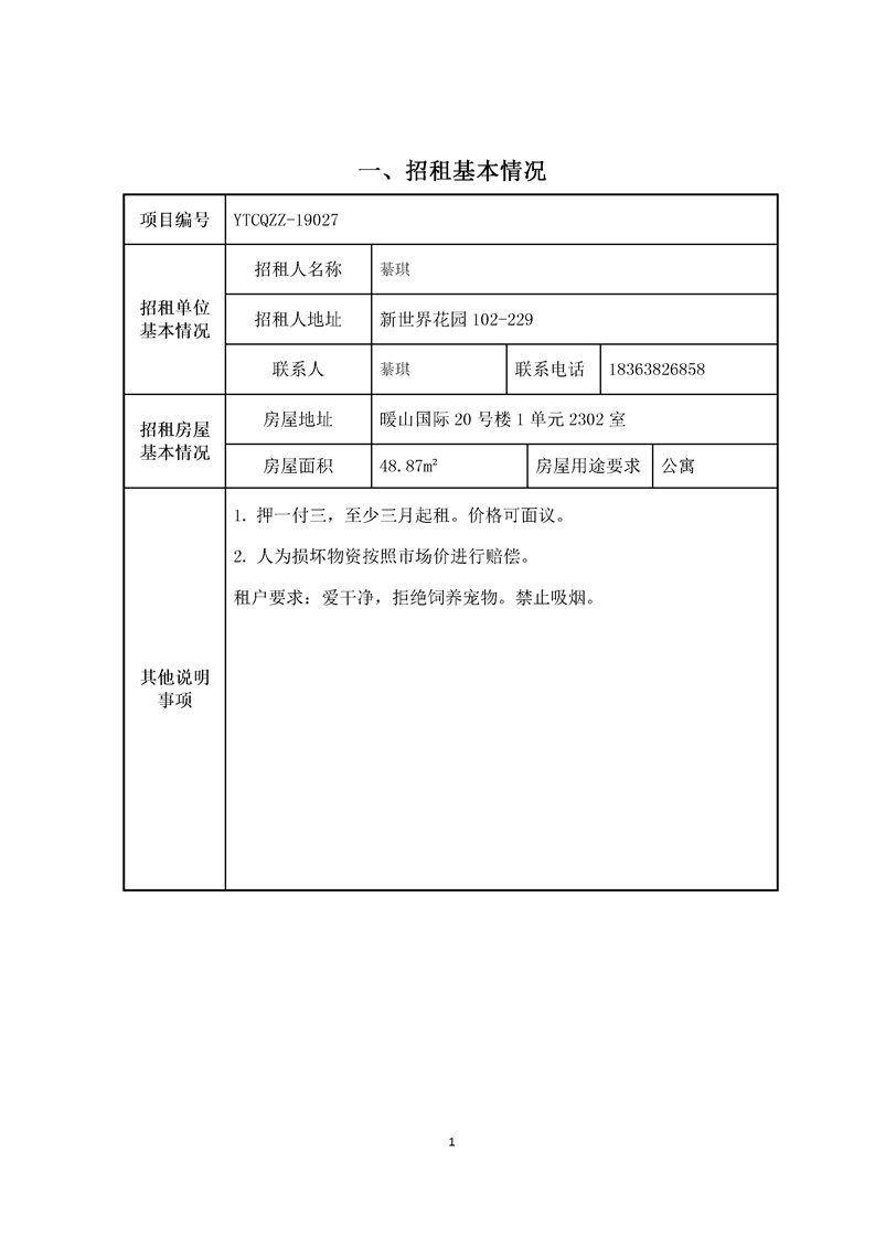 暖山國際20號樓1單元2302室招租