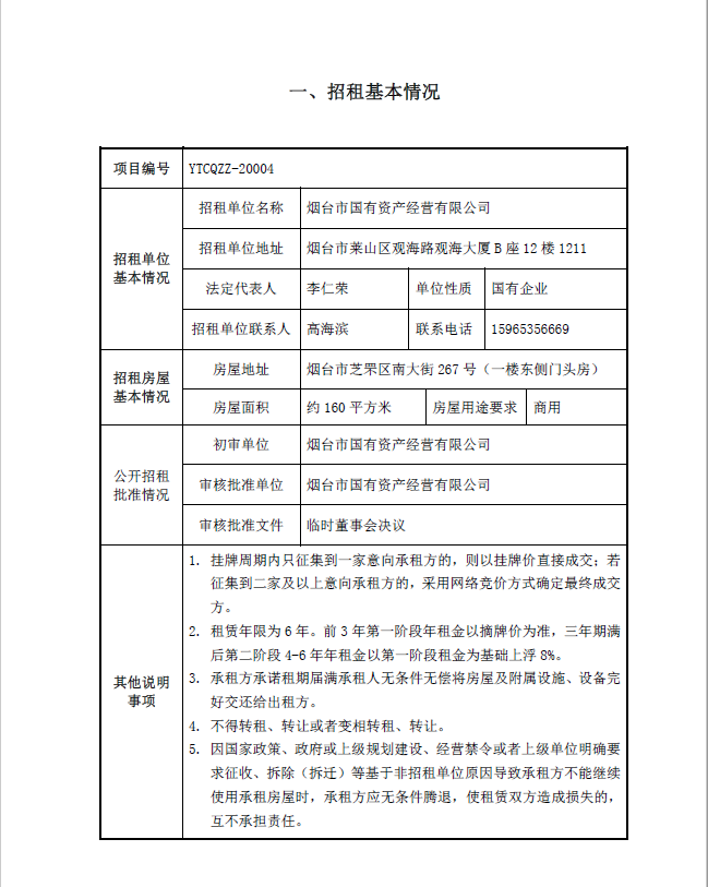煙臺市南大街267號一樓東側(cè)門頭房招租公告