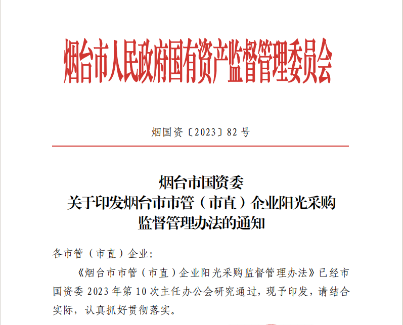 2024年6月30日,煙臺市國資委正式發(fā)布《煙臺市市管(市直)企業(yè)陽光采購監(jiān)督管理辦法》(以下簡稱:《管理辦法》),對進(jìn)一步加強國有企業(yè)陽光采購工作作出部署安排。