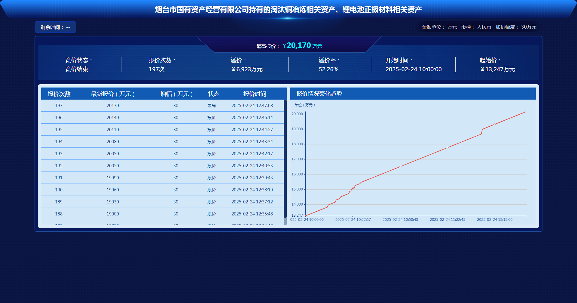 2月24日,“煙臺(tái)市國有資產(chǎn)經(jīng)營有限公司持有的淘汰銅冶煉相關(guān)資產(chǎn)、鋰電池正極材料相關(guān)資產(chǎn)項(xiàng)目”在山東產(chǎn)權(quán)交易中心以網(wǎng)絡(luò)競價(jià)方式成功出讓。此次交易歷經(jīng)197輪激烈競價(jià),持續(xù)近3小時(shí),最終成交金額定格在20170萬元,高于評估價(jià)8980萬元,較掛牌價(jià)溢價(jià)6923萬元,溢價(jià)率高達(dá)52.26%,成功創(chuàng)下煙臺(tái)聯(lián)合產(chǎn)權(quán)2025年首季資產(chǎn)盤活的“開門紅”。